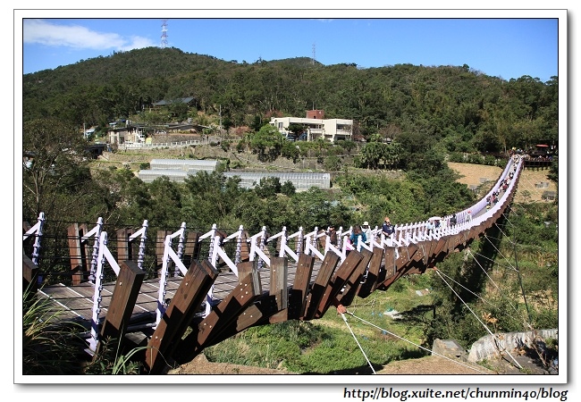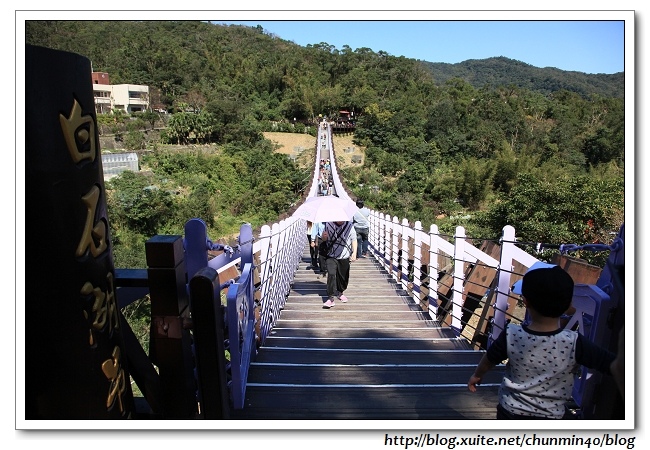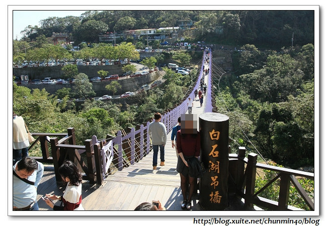 白石湖吊橋位於內湖碧山巖停車場旁,全長116公尺,是臺北市第一座大跨距的吊橋。遠看彷彿一條巨龍橫跨在忠勇山和大崙頭山間~