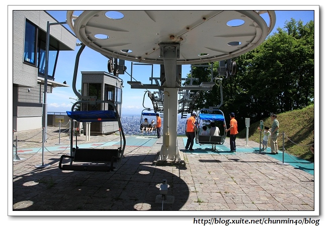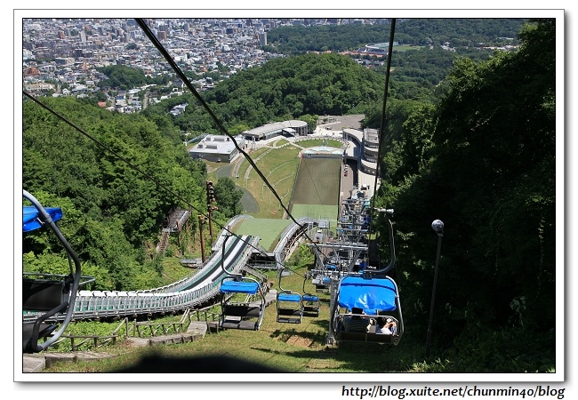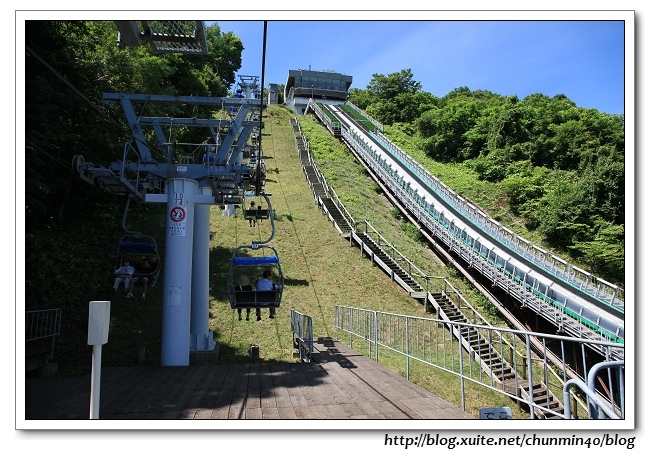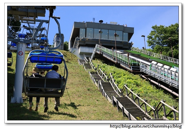 搭乘吊椅的5分鐘過程,正是體驗跳台滑雪選手感受的好時機。原本看似遙遠的景觀休閒廳迅速出現眼前,旁邊橫落而下的就是角度極陡的助滑坡。在如此近距離裡,眼裡看著起跳台感受跳台滑雪競賽時的臨場感,讓我不禁佩服那些選手敢往下一躍的勇氣!