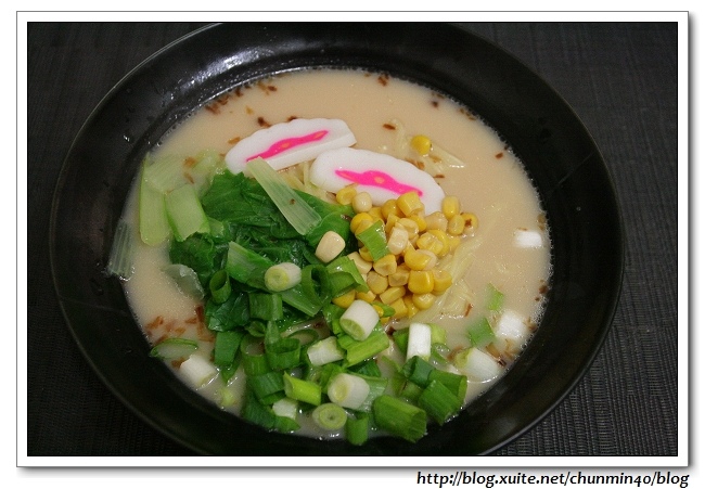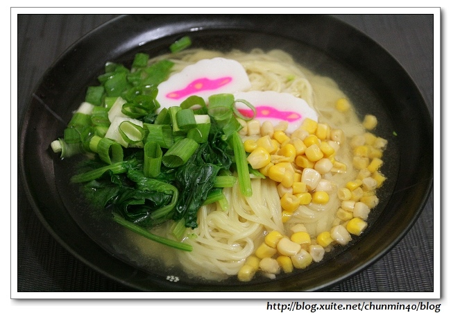 自己加了魚板、蔥花、玉米粒和小白菜……