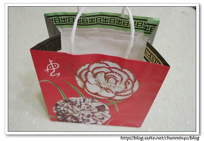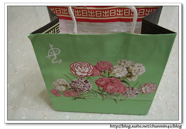 紙袋兩面不同花色,都是代表母親節的康乃馨花朵~