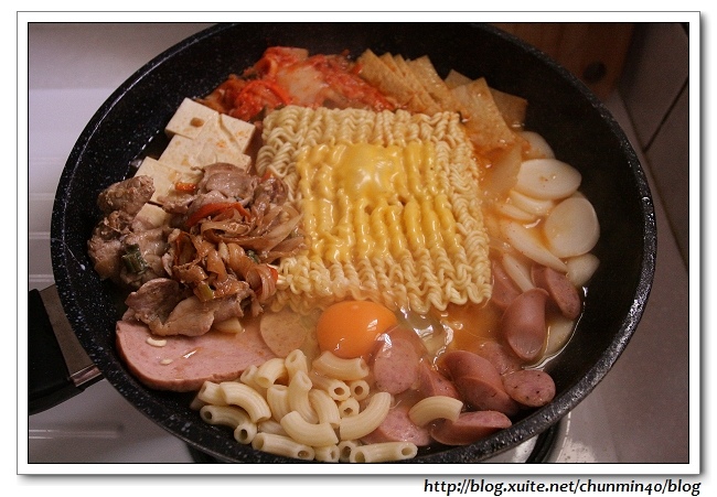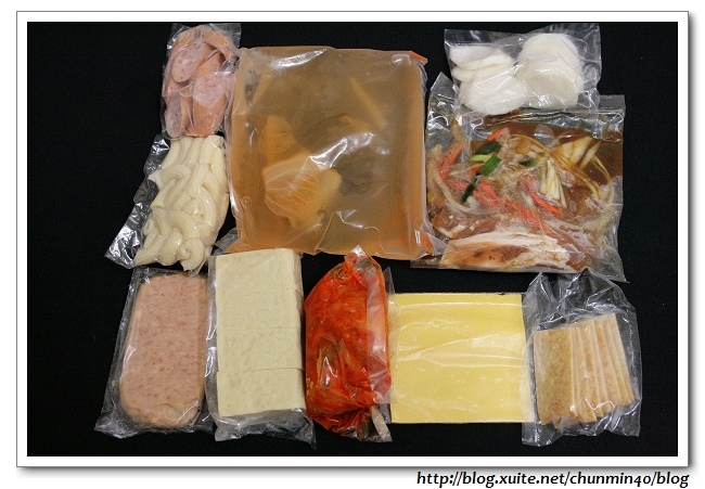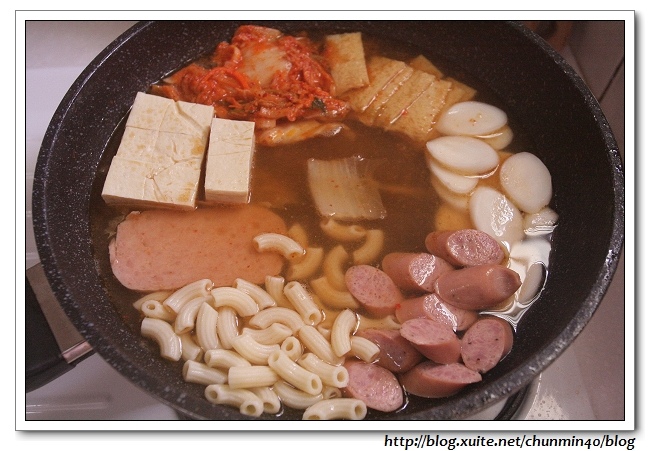 3.依序放入各項食材 → 豆腐 → 泡菜 → 德式香腸 → 年糕 → 韓國魚板 → 午餐肉→ 通心粉