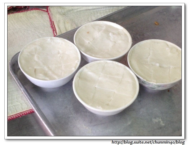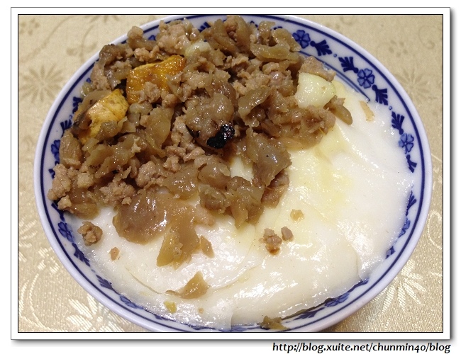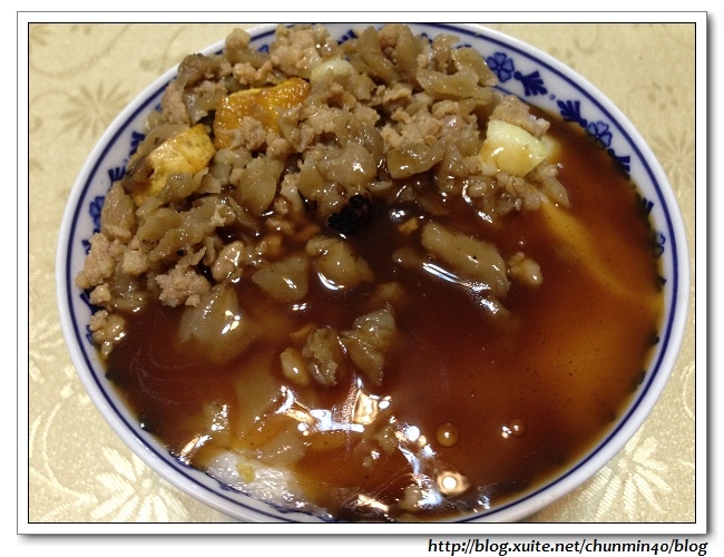 碗粿,上面有肉絲菜圃和豆干,吃起來肉味很重。