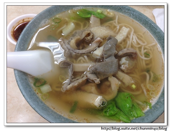 舒國治形容這為「白湯牛雜」~的確!整碗湯幾乎清如水,沒有任何調味或中藥的味道,只有著清燉牛雜原味的鮮甜。牛雜種類很多,都處理得很乾淨,口感偏軟但不爛。麵條是細麵,但是也不軟爛,Q度還在。