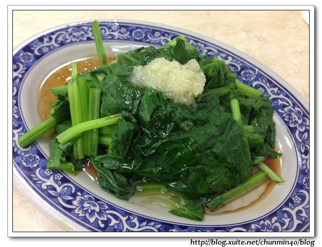 燙菠菜,上頭淋上蒜泥,菠菜蠻老的,纖維質很粗。