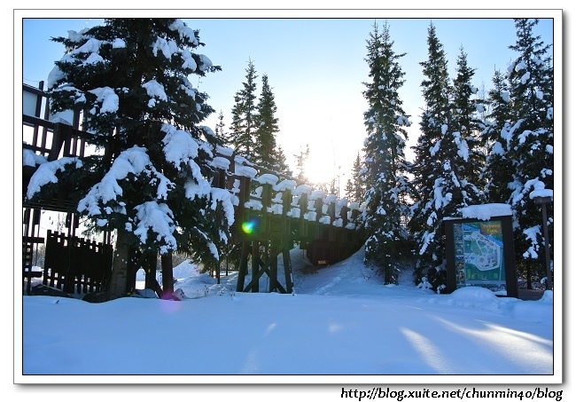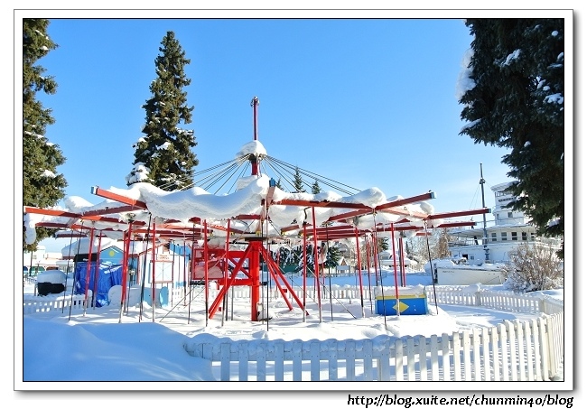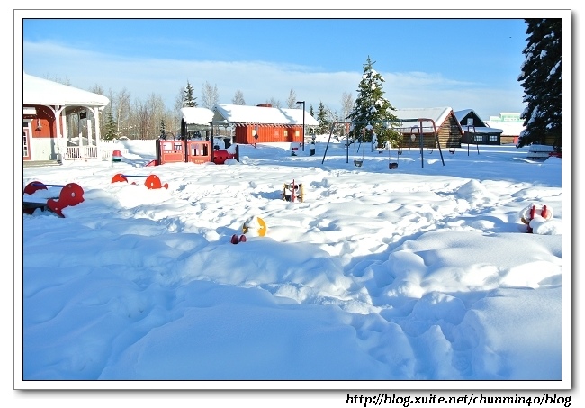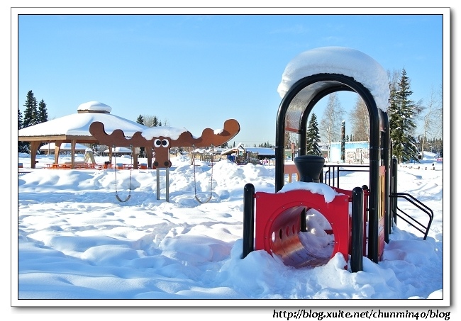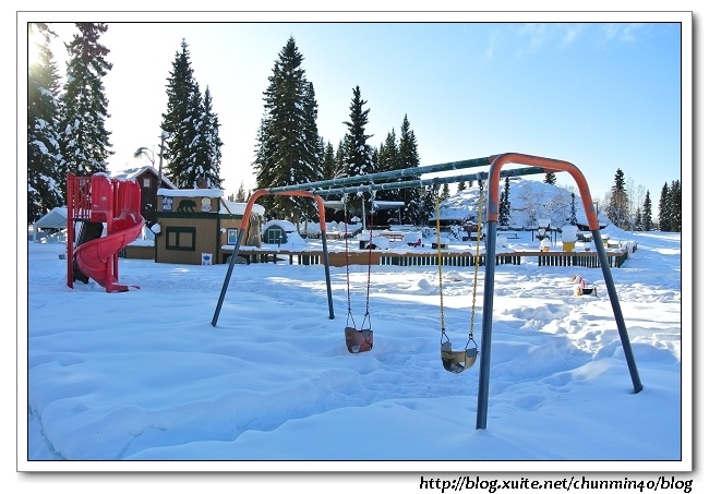 出來是小孩子玩的small playground,這裡真是老少咸宜的地方啊!不過應該是在夏天!!這裡雪積的那麼厚,根本無法進入,但可想而知這邊的夏天一定很熱鬧。