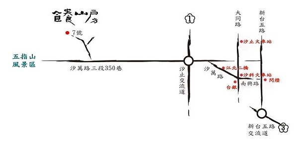 食養山房原本是在陽明山,於去年2009年底搬到汐止汐萬路這邊來。從國道三號新台五路交流道下來,經過宏碁大樓,看到連興街這條小巷子左轉進去,接汐萬路一段,經江北二橋,再往五指山風景區行駛,到汐萬路三段350巷,轉入巷口後直走下坡進入即到達,沿路都沒有指標,所以一定要記得餐廳地址才不會找不到。