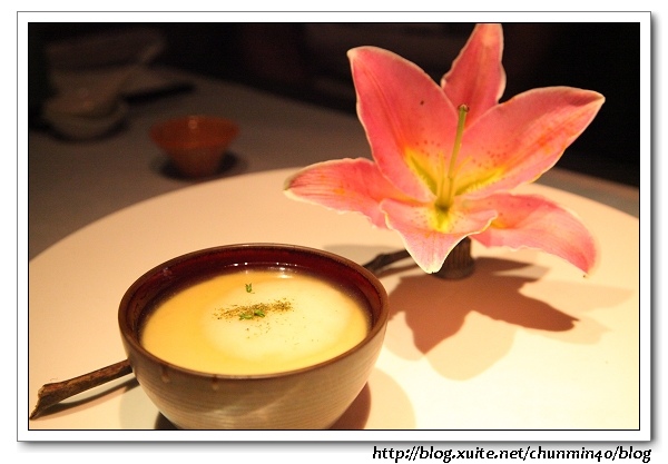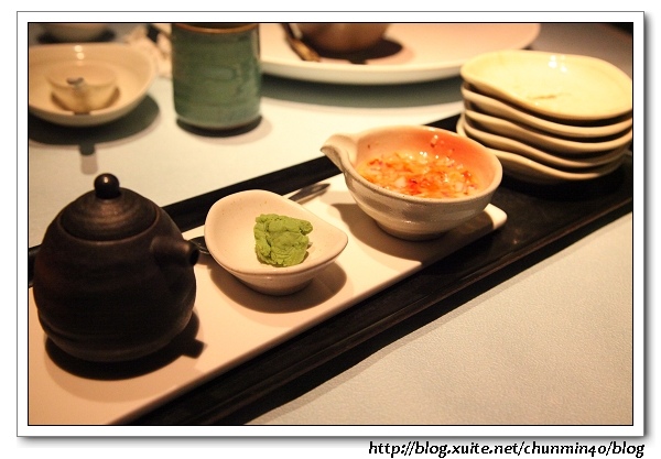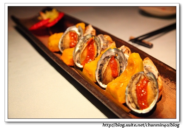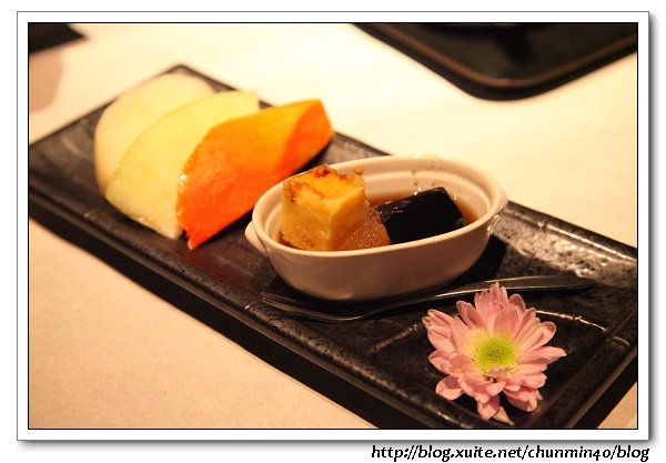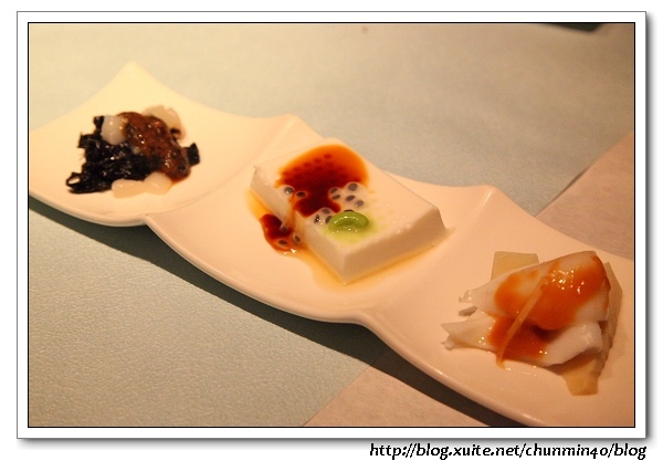 開胃前菜:中間是手工豆腐,右邊是花枝舖在竹筍上,左邊那道則是生干貝佐紫菜。服務生建議先從清淡的手工豆腐開始吃起,這豆腐真是超級好吃,很香又滑嫩!其他兩道菜的食材也都很新鮮,生干貝完全沒有腥味,連不敢吃生食的我都有吃完!