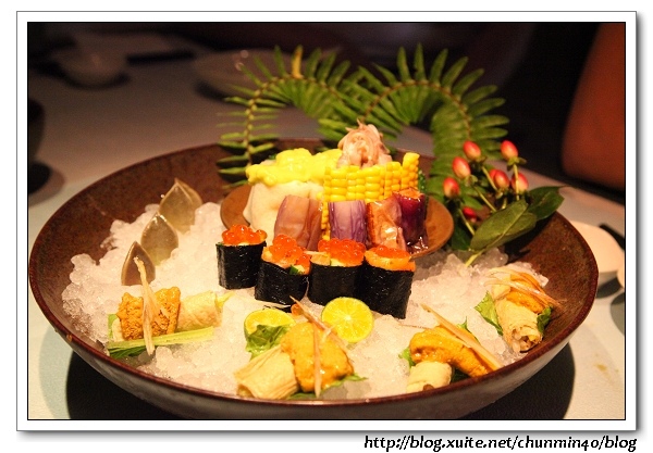 左邊有四片石蓮花瓣,前方則是海鮮捲上舖海膽。