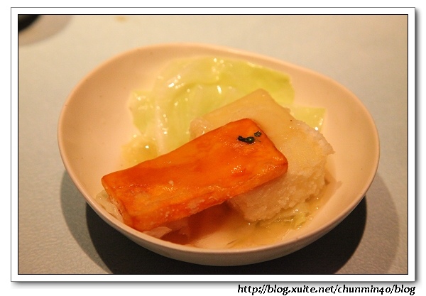這道我不知道名字,只知中間是宜蘭名產糕渣,下面舖的是高麗菜,上頭放一片超級好吃的地瓜。夏天的地瓜通常都不好吃,纖維很粗又不香甜,但這完全不會~質地細緻綿密,地瓜香甜全表露無遺,優!