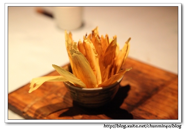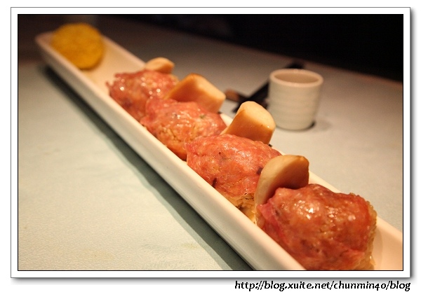 沙拉米手捲,基本上吃到這道我已經吃不下了,所以只淺嚐一口。義大利火腿包著油飯,底下舖微酸的筍絲,在配上杏鮑菇,整個清爽不油膩!