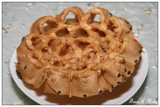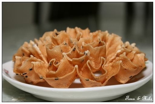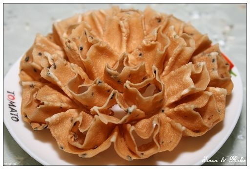 一片跟女生的手差不多大。吃起來味道像油條加上黑芝麻,但沒油條那麼油,口感屬於酥脆的,香香的不錯吃!