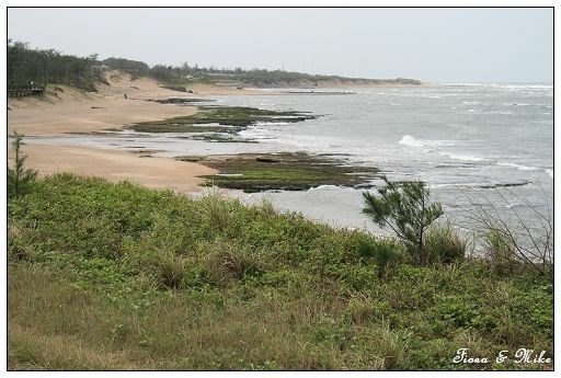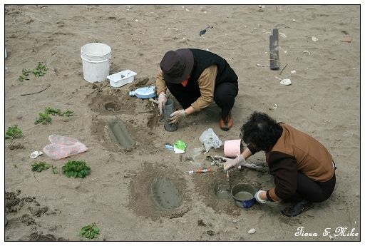 這裡有一群人利用細沙挖洞來當模子,作出他們想要的花盆形狀,Rainie覺得很好奇,一直觀看而不捨離去...後來才知道,這邊退潮後會顯露出一大片藻礁,藻礁裡有好多寄居蟹、螃蟹、魚,所以很適合帶小孩來這玩......