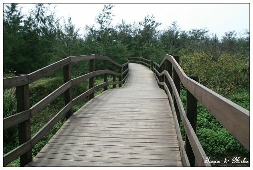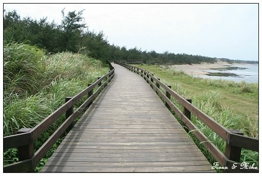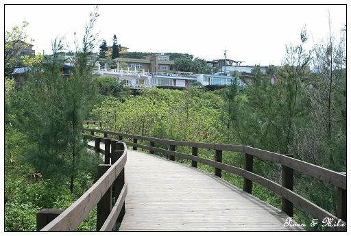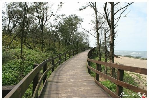 這條棧道長達1千200公尺,架空在沙灘與海岸樹林上,棧道向內陸的一面是海岸防風林,有濃密的木麻黃和黃槿,因為東北季風影響,這些樹木都向同一個方向伸展,俗稱「風剪樹」,漫步臨海木棧道或駐足, 觀海戲水賞夜景,令人備感恬靜悠閒,是一處幽靜和隱密的海角樂園,頗適合全家漫步!