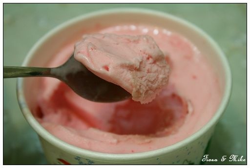 大湖草莓:草莓不香,整體水水的,吃起來只有酸度而沒有甜度,跟我們吃新鮮草莓那種酸酸甜甜的感覺有段差距。在做水果基底的冰淇淋來說,草莓是很容易帶出顏色跟香氣水果,看這份冰淇淋的質地,想必不是真材實料的吧!